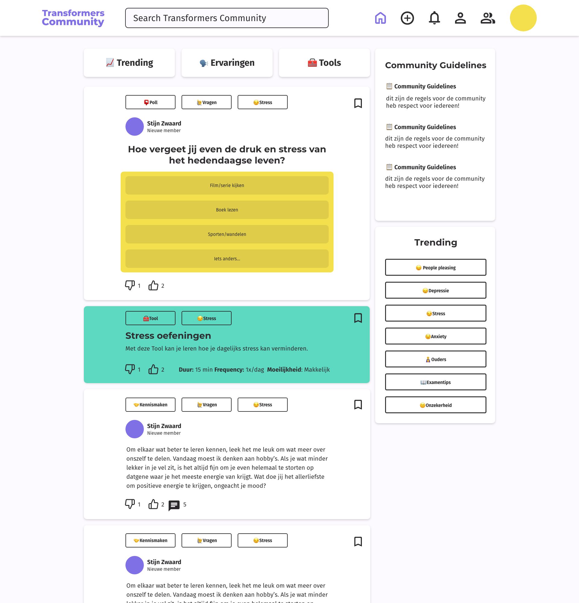 Op de community pagina komen er veel onderwerpen ter spraken, de gebruikers hebben aangegeven dat ze niet in alles geïnteresseerd zijn, daarom heb ik een home pagina ontworpen die veel focus legt op filteren. Alle posts zijn voorzien van tags die waardoor het makkelijk is om als gebruiker door de site heen te lopen en alleen maar content zien waar die persoon interesse in heeft. Op de site kan je ervaringen van andere lezen, maar je hebt ook tools die het platform biedt om je te helpen met moeilijke situaties, deze tools hebben een andere kleur(turqouise) zodat je ze makkelijk kan vinden.